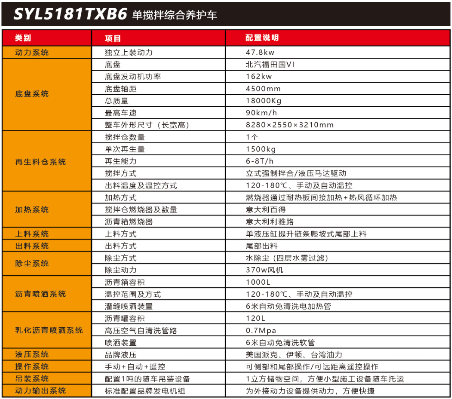 SYL5181TXB6 單攪拌綜合養(yǎng)護車是一款集現場生產新瀝青混合料、瀝青路面冷料、 舊料、銑刨料100%現場加熱再生利用 ,熱瀝青灑布、裂紋跟蹤灌縫、乳化瀝青噴灑、為其他裝置提供電力和液壓動力等多種功能于一體的瀝青路面熱再生綜合養(yǎng)護車??蓪崿F多場合、多路面的各種類養(yǎng)護作業(yè) ,養(yǎng)護修補費用低 ,作業(yè)快捷 ,高效率、節(jié)能環(huán)保性能突出等特點。適用于遠郊較寬闊區(qū)域中大施工量和高速公路的修補施工。