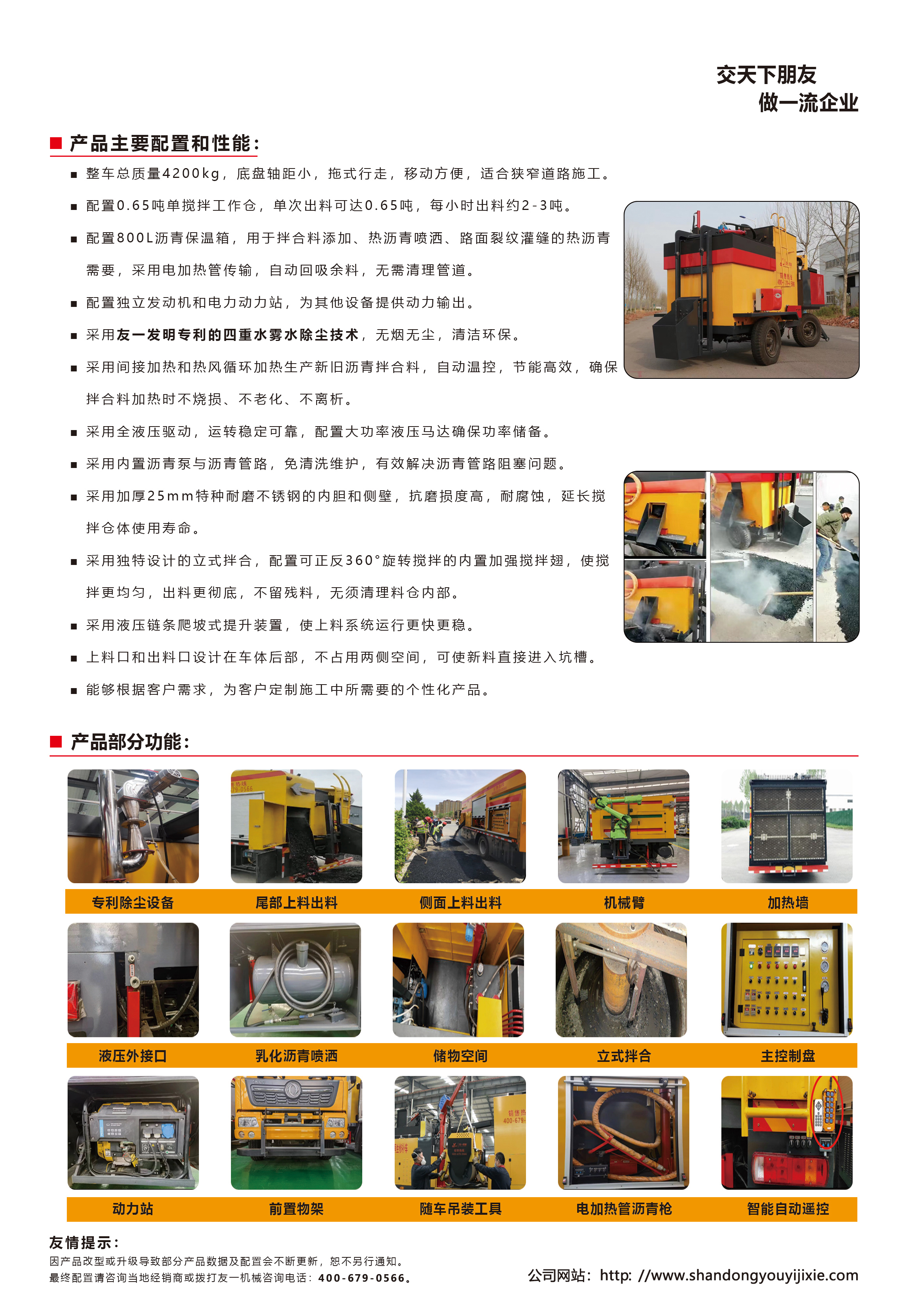 山東友一機(jī)械設(shè)備有限公司主要生產(chǎn)路面綜合養(yǎng)護(hù)車、瀝青路面養(yǎng)護(hù)車、道路養(yǎng)護(hù)車、瀝青熱再生修補(bǔ)車、瀝青灌縫機(jī),專注、專業(yè)于道路養(yǎng)護(hù)機(jī)械設(shè)備與養(yǎng)護(hù)材料的生產(chǎn)和研發(fā)。
