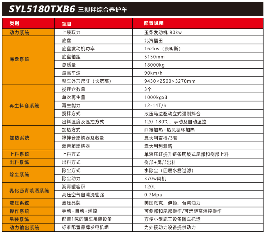 SYL5180TXB6 三攪拌路面綜合養(yǎng)護(hù)車是一款集現(xiàn)場生產(chǎn)新瀝青混合料、瀝青路面冷 料、舊料、銑刨料 100%現(xiàn)場加熱再生利用,熱瀝青灑布、裂紋跟蹤灌縫、乳化瀝青噴灑、 為其他裝置提供電力和液壓動力等多種功能于一體的瀝青路面熱再生綜合養(yǎng)護(hù)車。可實現(xiàn)多場合、多路面的各種類養(yǎng)護(hù)作業(yè)。養(yǎng)護(hù)修補費用低 ,作業(yè)快捷 ,高效率、節(jié)能環(huán)保性能